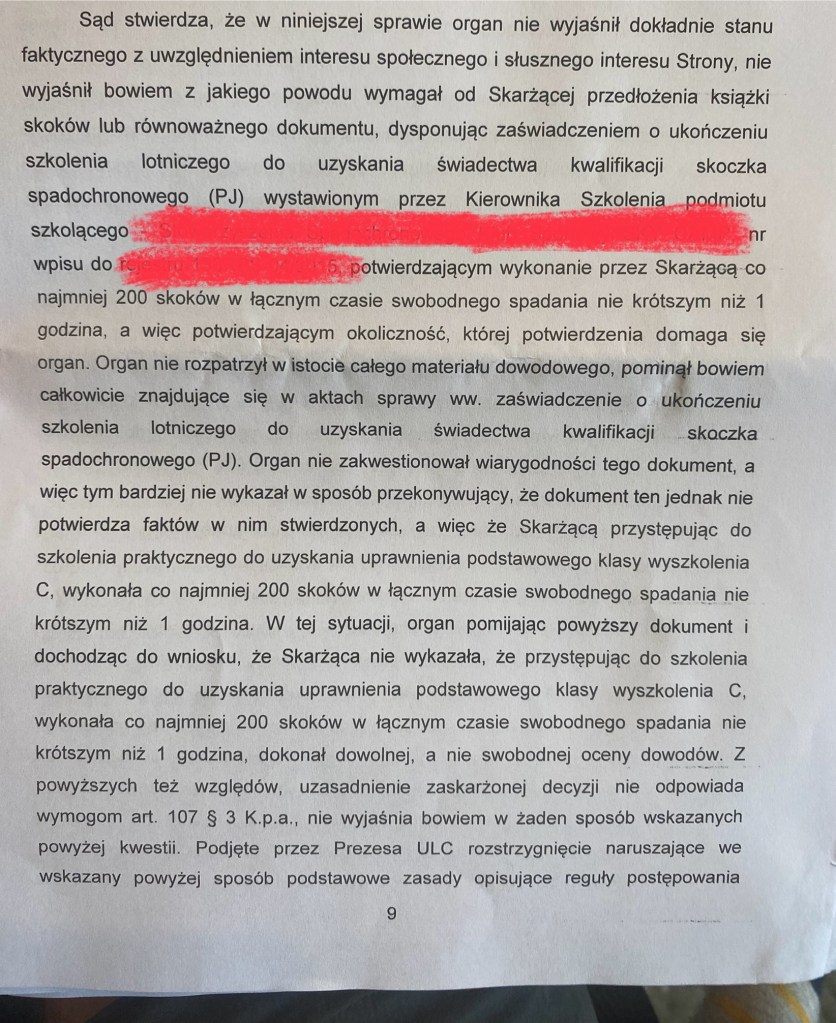 Na marginesie to sam Prezes ULC opracował wzór zaświadczenia, gdzie HT musi zaznaczyć czy szkolony spełnia warunki wstępne (200 skoków i 1 h swobodnego spadania). Sąd kilkukrotnie podkreślił, że Prezes ULC naruszył przepisy postępowania administracyjnego. Naruszone zostały zasady praworządności, pogłębiania zaufania obywateli do władzy publicznej i prawdy obiektywnej. WSA wydał też bardzo jednoznaczne wytyczne do dalszego postępowania – albo Prezes ULC uzna to co znajduje się w zaświadczeniu albo „wyjaśni w przekonywujący i potwierdzony obiektywnymi okolicznościami sposób” dlaczego zaświadczenie jest niewiarygodne.