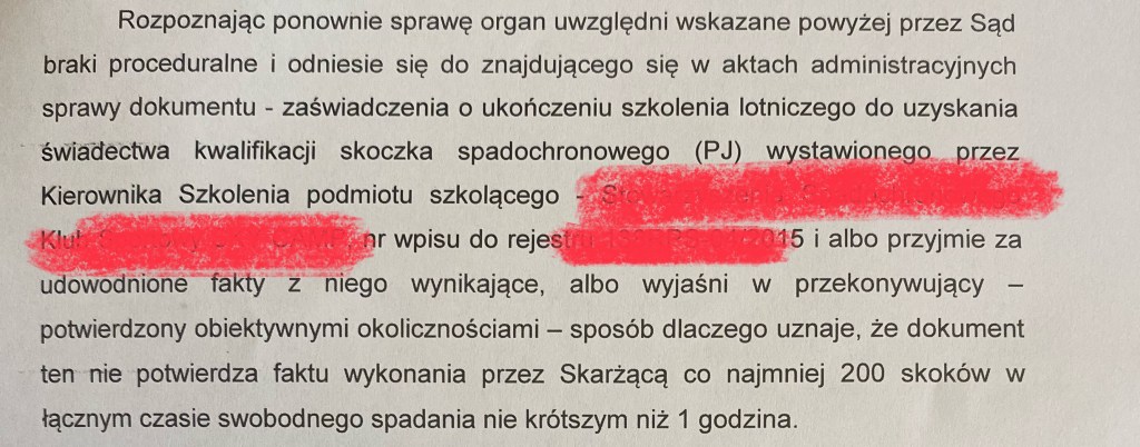 Moja klientka złożyła wniosek o wydanie świadectwa kwalifikacji skoczka spadochronowego z uprawnieniem PJ(C). Spełniała wszystkie wymagania, mimo to Prezes ULC wezwał ją do przedstawienia książki skoków, żeby upewnić się, że spełniała ona warunki wstępne do szkolenia lotniczego. Prezes ULC zażądał tego mimo, że kierownik szkolenia wydał zaświadczenie o ukończeniu szkolenia i potwierdził, że warunki wstępne zostały spełnione. Dodam tylko, że żaden przepis prawa nie wymaga żeby na etapie wnioskowania o wydanie ŚK składać książkę skoków.